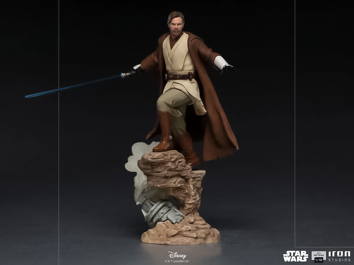 Figura de poliresina sobre una base con forma de roca, con los restos de un artefacto tecnológico incrustado en su superficie, pintada a mano que mide unos 28 cm.
