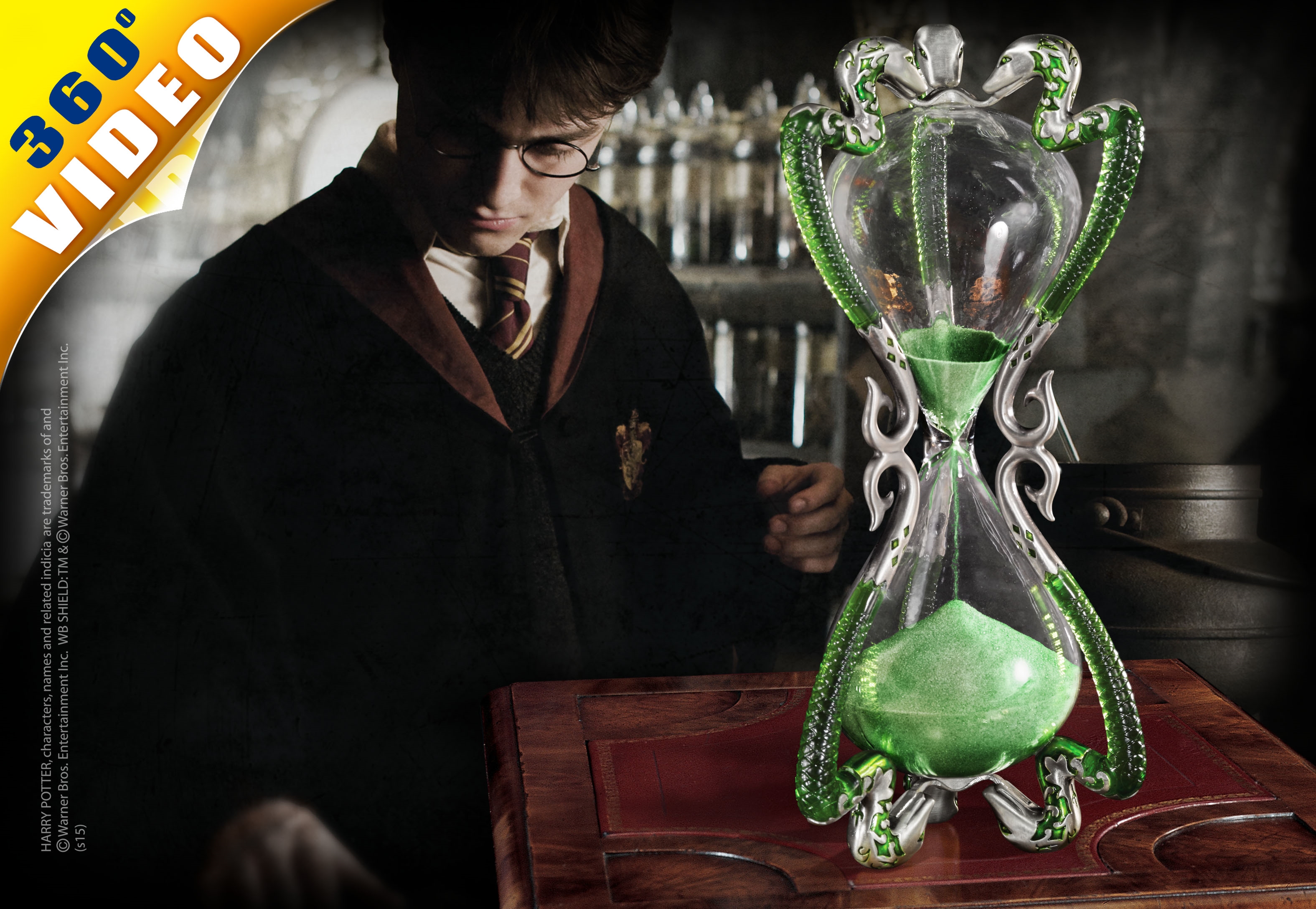 Réplica del famoso reloj de arena del profesor Slughorn. Mide 25 cm de alto y está fabricado con peltre fino, metal fundido a presión, ABS translúcido y esmalte. Calibrado para medir aproximadamente una hora.