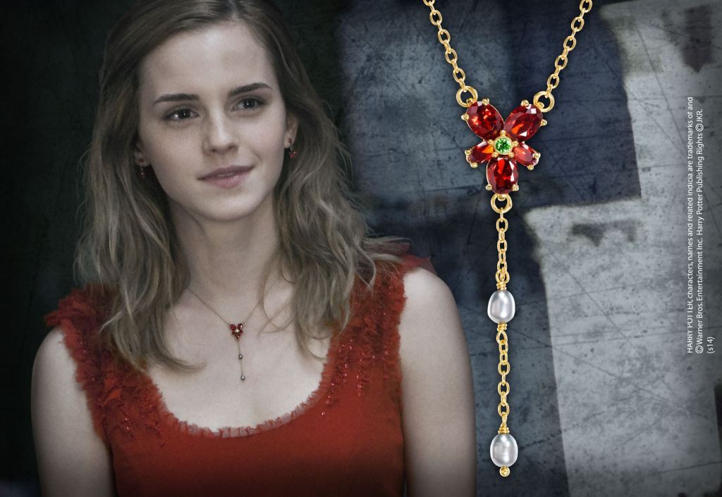 Réplica exacta que usó Hermione Granger en ‘Harry Potter y las Reliquias de la Muerte’. Elaborado en plata de ley y engastado con cristales, vidrio facetado y perlas de agua dulce. El collar mide aprox. 45 cm.
