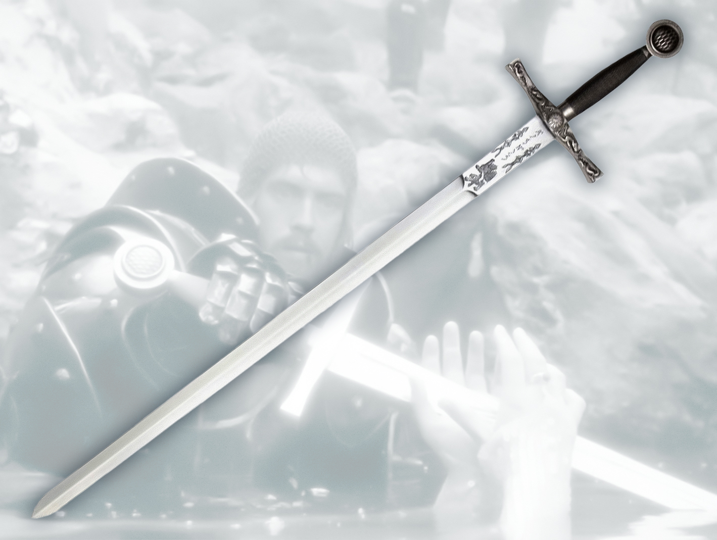 Réplica de la espada del Rey Arturo fabricada en metal, funda de plástico forrada y extraíble. Tamaño 111 cm.