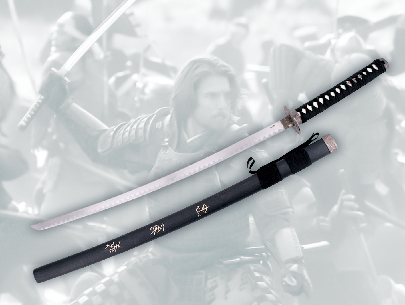 Vaina negra con grabado ‘Corage, Deber y Lealtad’, de 79 cm, hoja de acero 45 cm, mango con encordado negro, viene con soporte.