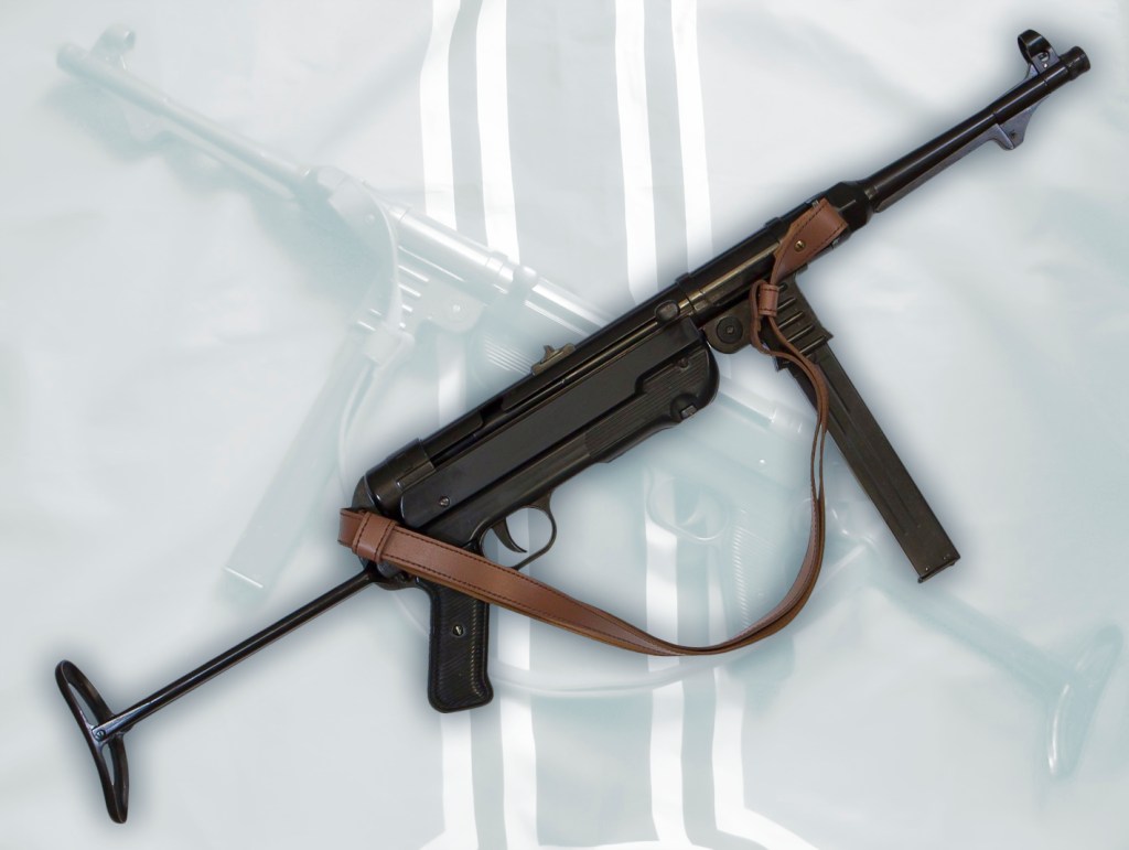Reproducción de subfusil MP40 (Alemania, 1940). Fabricado en metal y plástico, con mecanismo simulador de carga y disparo, cargador extraíble y correa de piel ajustable. Tamaño: 64 cm.