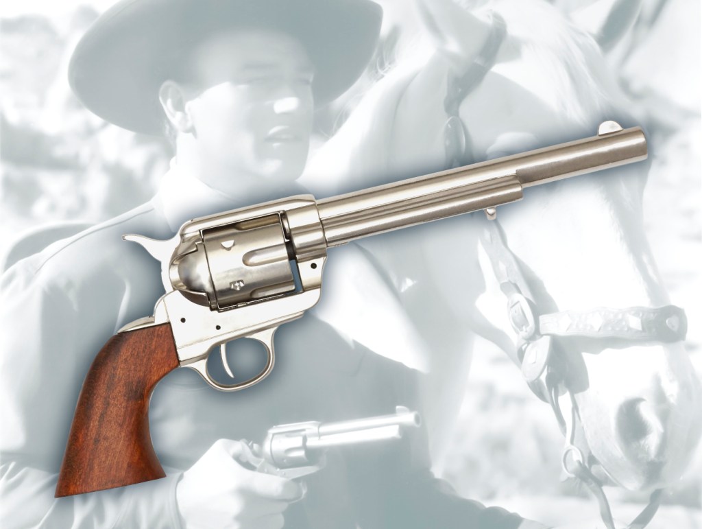 Reproducción de revólver Cal.45 Peacemaker 7½» (USA, 1873). Fabricada en metal y madera, con mecanismo simulador de carga y disparo y tambor giratorio. Tamaño: 35 cm.