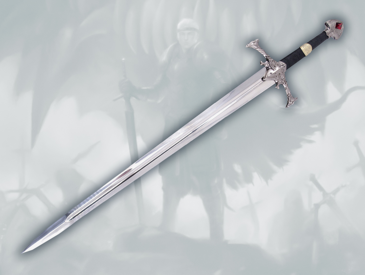 Modelo de la espada de la casa del dragón de Aegon el conquistador de la casa Targaryen, réplica según el libro. Réplica no oficial, con un tamaño total de 107 cm, hoja en níquel con la empuñadura de 2 dragones, mango en negro con un detalle en dorado y un diamante en rojo con soporte de madera.