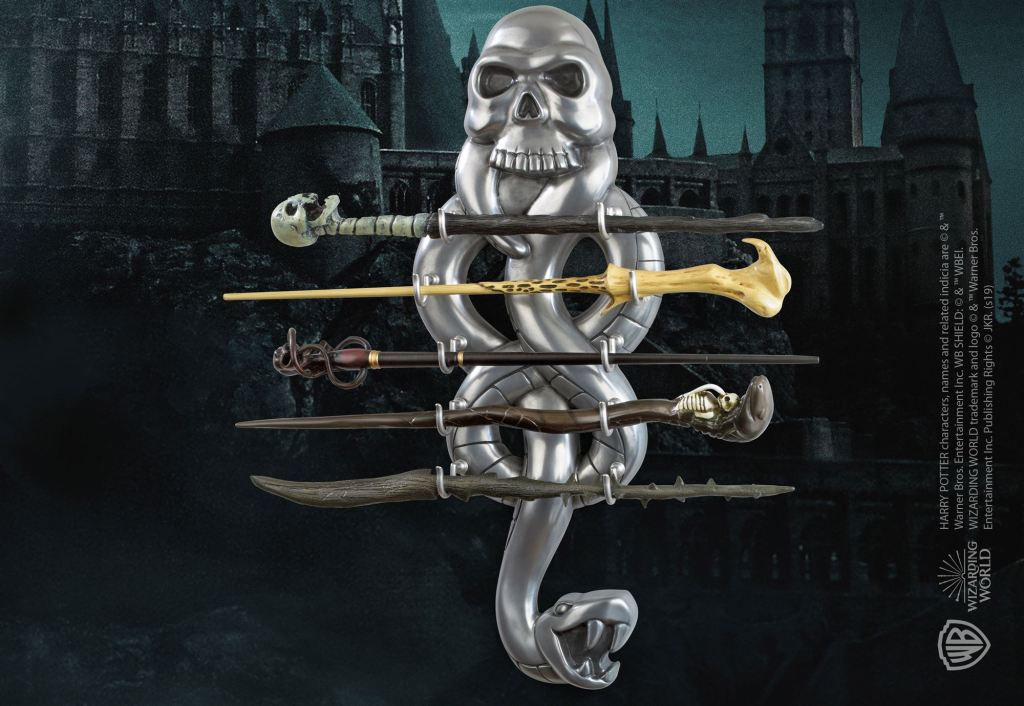 El set incluye un expositor Dark Mark y réplicas de varitas (Lord Voldemort y cuatro Death Eaters). La pantalla mide 43 x 16 cm. Las varitas miden aprox. 16 cm de largo.
