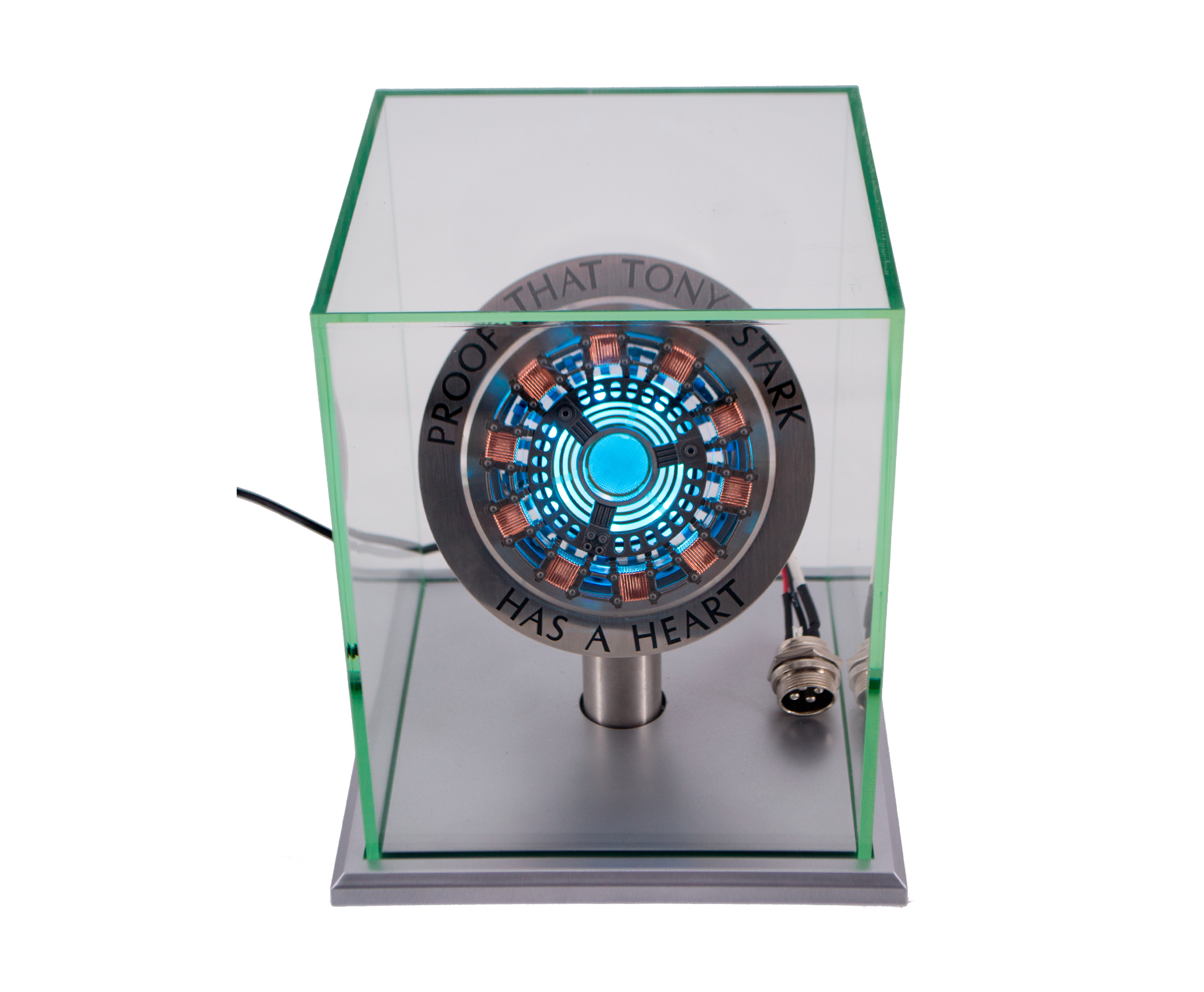 Base decorativa con luz. Modelo corazón de Tony Stark, réplica no oficial, con un tamaño total de 16,5cm x 16,5cm x 19 cm. Hecho en acero y con luz led, se activa por sonido.