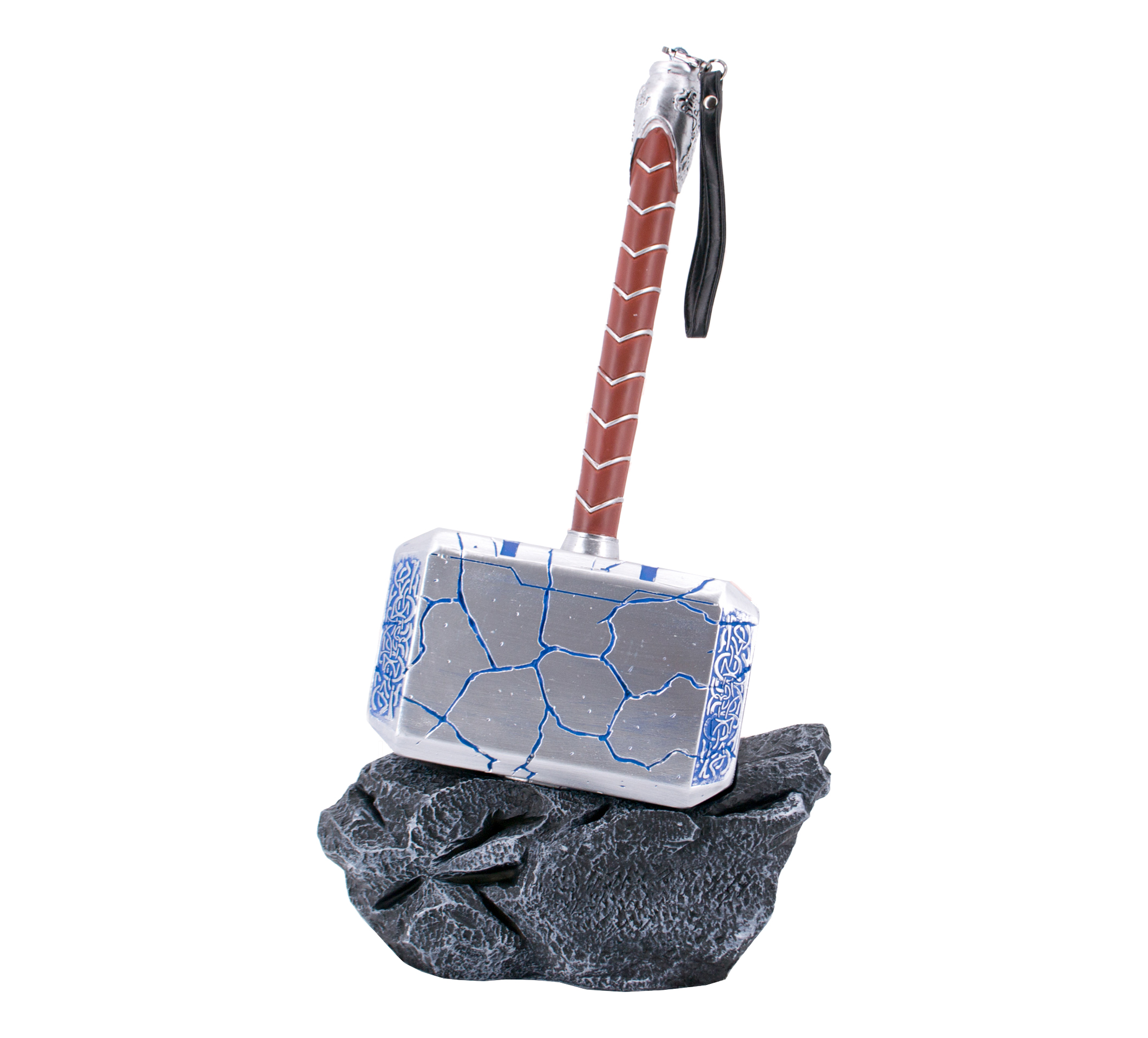 Réplica no oficial. El martillo es de color níquel, con efecto roto y detalles en azul. Hecho de resina. Base incluida. Tamaño: 32 cm x 16 cm x 55cm