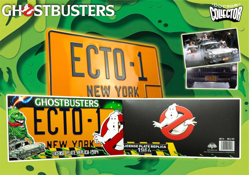 Réplica a escala 1/1 de la famosa placa ‘Ecto-1’ del automóvil de la película ‘Cazafantasmas’. Dimensiones: 33 x 16 cm.