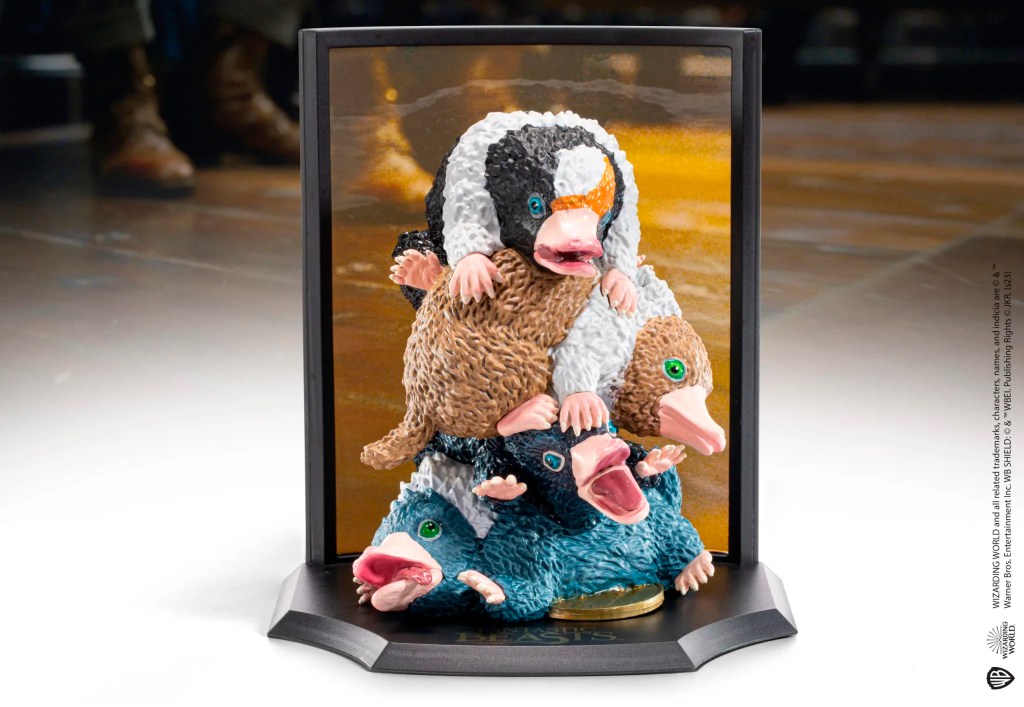 Muestra a 4 ansiosos bebés Nifflers apilados en lo alto de una moneda brillante. Tamaño aprox.: 12×17 cm.