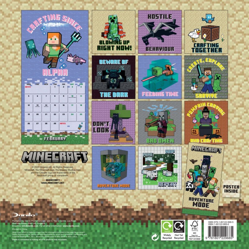 Este calendario de pared de ‘Minecraft’ tiene una duración total de 12 meses que abarcan desde Enero hasta Diciembre de 2024. Incluye diferentes ilustraciones para cada mes del año y un póster en su interior. Tiene un tamaño de 30 cm de ancho por otros 30 de alto.