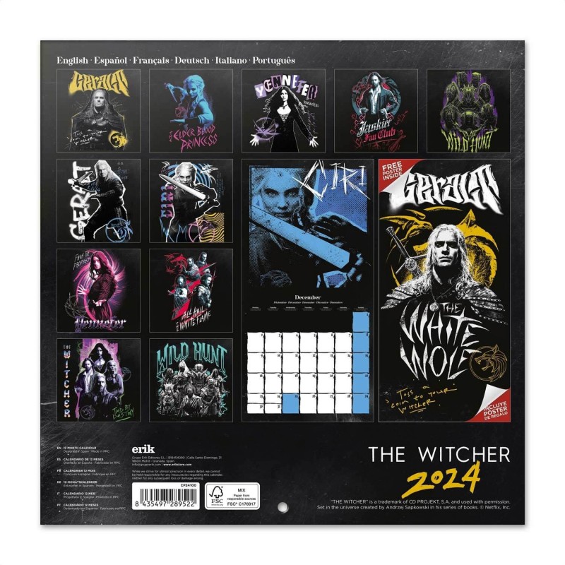 Este calendario de pared de ‘The Witcher’ tiene una duración total de 12 meses que abarcan desde Enero hasta Diciembre de 2024. Incluye 12 imágenes y un póster central en su interior. Respecto a su tamaño, mide 30 cm de ancho por otros 30 de alto.