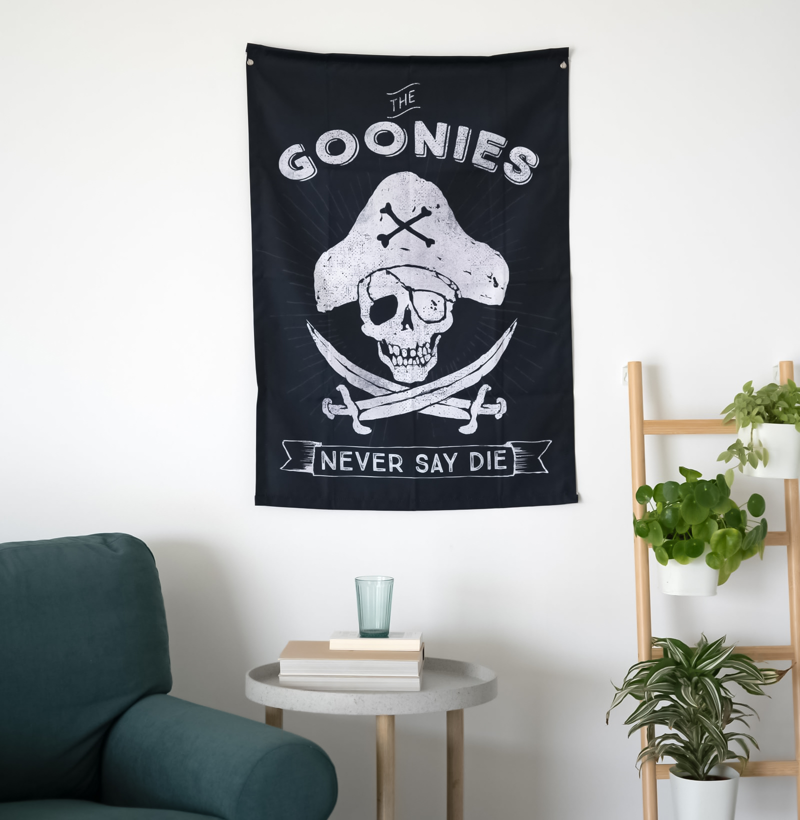 Esta banderola de ‘Los Goonies’ está fabricada en tela 100% poliéster y tiene un tamaño de 100 cm de alto por 70 de ancho. Lleva incorporados dos sistemas de sujeción distintos en la parte superior: dos orificios situados a cada extremo y, por otro lado, un espacio que deja la costura superior, por la que se puede hacer pasar un cable o varilla.