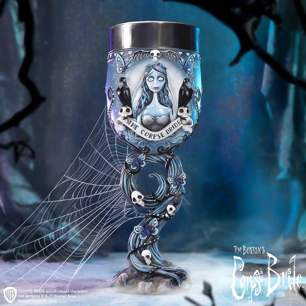 Copa con licencia oficial ‘La Novia Cadáver’. Poliresina con inserción de acero inoxidable y pintado a mano. Mide aprox. 20,6 cm. No apto para lavavajillas.