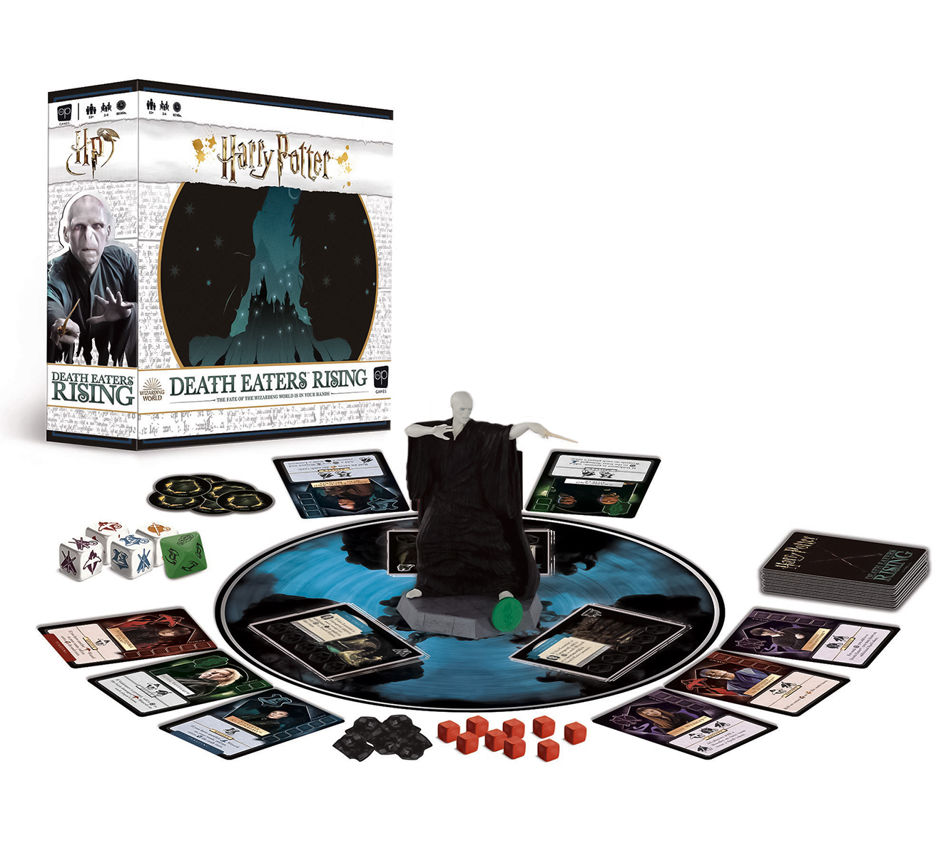 Contenido: 44 tarjetas de personajes, 1 figura de Lord Voldemort esculpida personalizada, 1 tablero de ubicación, 6 tarjetas de cuartel, 1 tarjeta de villano grande, 6 fichas de misión, 6 tarjetas de lugar, 1 dado de mago de color marfil, 1 troquel Voldemort de 8 lados, 24 fichas de hechizos, 60 contadores de daño, 15 contadores de corrupción, 1 libro de reglas.