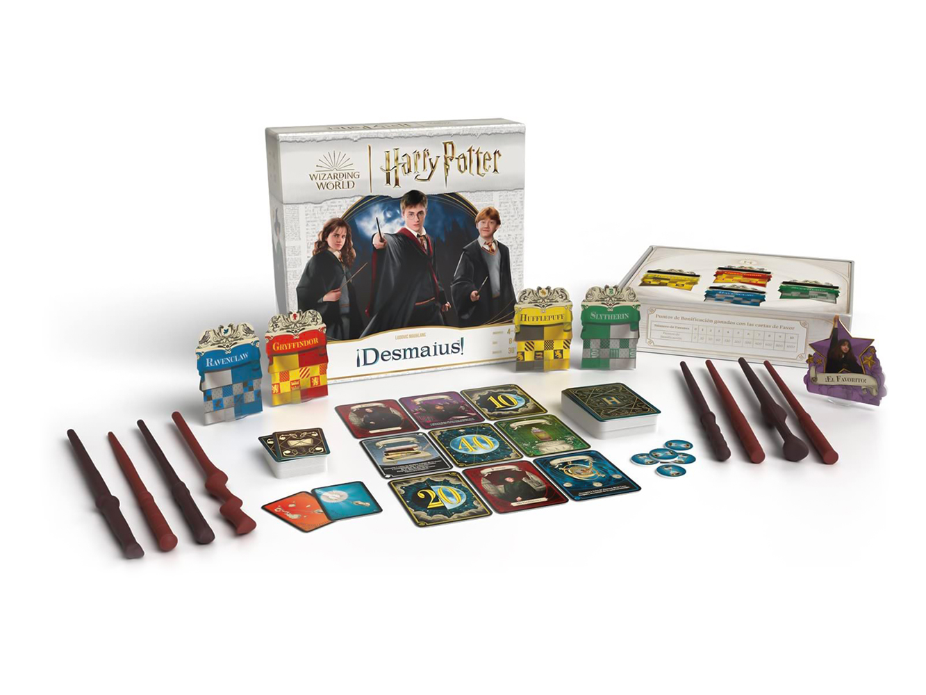 Contiene: 1 tablero, 8 varitas, 9 fichas de bandera, 1 ficha de favorito, 142 cartas, 24 fichas, 10 soportes de plástico, 1 reglamento.
