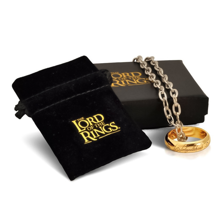 Réplica oficial del anillo de Sauron. Se entrega con su cadena (60 cm) y un estuche de terciopelo con el escudo de la película. Material: acero inoxidable (dorado).