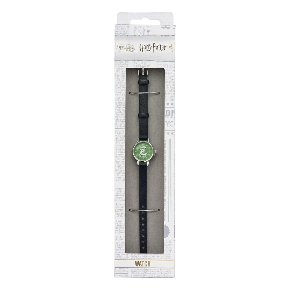 Reloj oficial de la casa Slytherin con correa de piel sintética y hebilla de aleación de zinc. La correa negra está hecha de poliuretano y es de 8 mm de ancho. El reloj se suministra con una batería de óxido de plata.