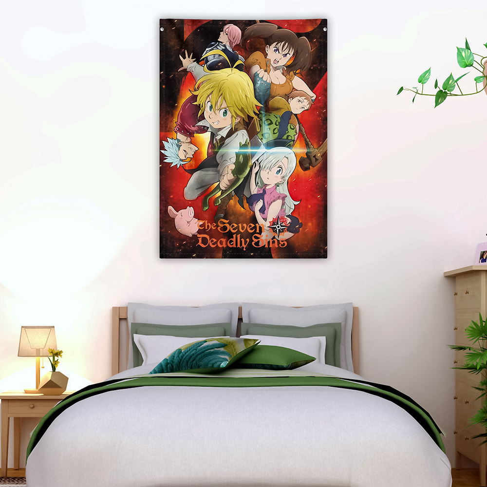 Esta banderola de ‘Nanatsu no Taizai’ está fabricada en tela 100% poliéster y tiene un tamaño de 100 cm de alto por 70 de ancho. Lleva incorporados dos sistemas de sujeción distintos en la parte superior: dos orificios situados a cada extremo y, por otro lado, un espacio que deja la costura superior, por la que se puede hacer pasar un cable o varilla.