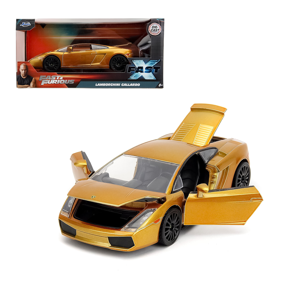Lamborghini Gallardo Gold basado en la película ‘Fast X’, a escala 1/24. Fabricado en metal fundido a presión con neumáticos de goma. Las puertas y el capó se abren.