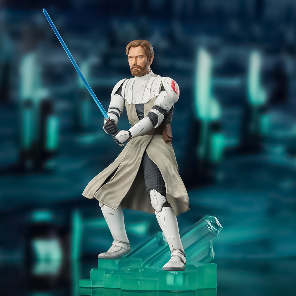 Estatua de poliresina de Obi-Wan basada en su apariencia durante las Guerras Clon con su armadura y su sable láser activado. Con aproximadamente 28 cm de altura sobre una base cristalina, esta escultura está limitada a solo 3.000 piezas, y viene empaquetada en una caja a todo color con un certificado de autenticidad numerado.