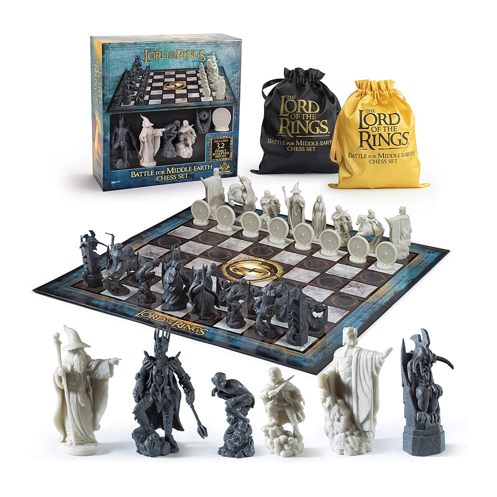Juego de ajedrez intrincadamente detallado, que incluye 32 piezas de PVC finamente esculpidas y tablero de ajedrez gráfico completo. Las piezas de ajedrez miden de 5 a 10 cm. El tablero mide 47 x 47 cm.