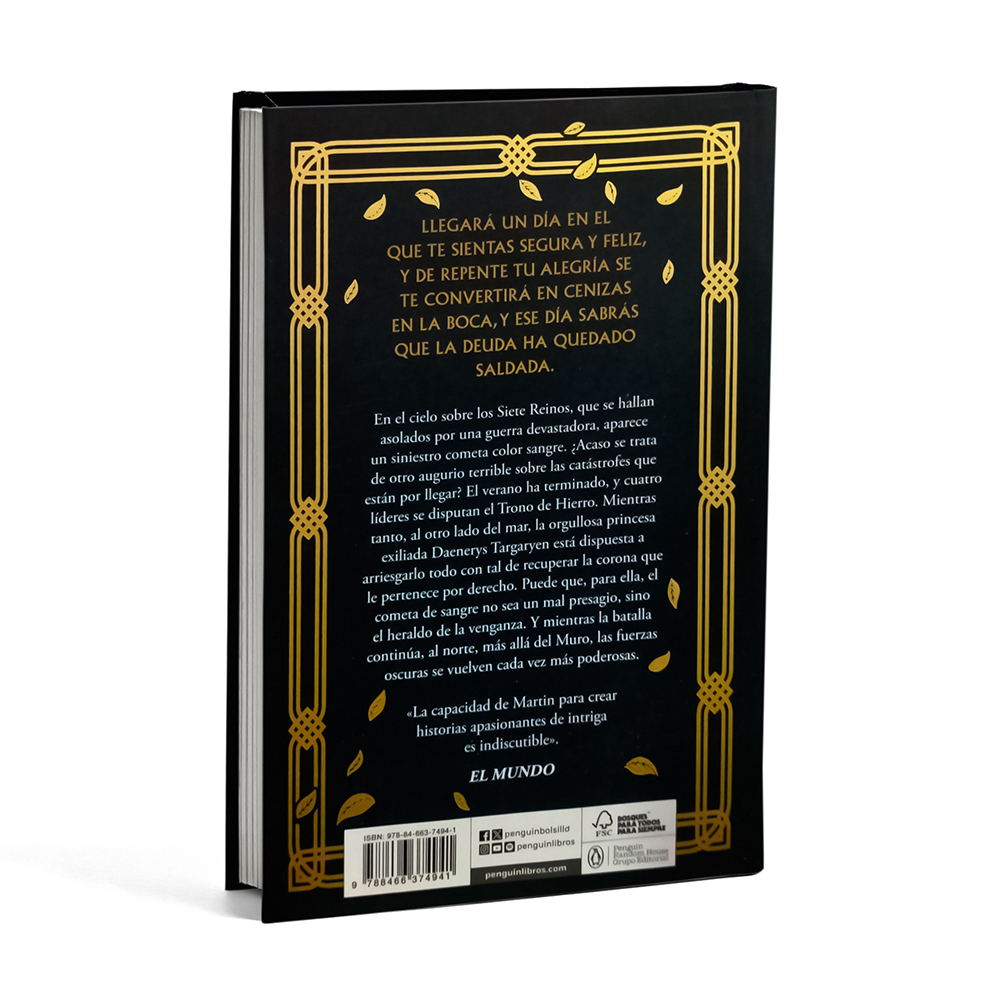 Los cinco títulos hasta ahora publicados de ‘Canción de Hielo y Fuego’, Juego de Tronos, Choque de Reyes, Tormenta de Espadas, Festín de Cuervos y Danza de Dragones, llegan a las librerías en una nueva edición que conquistará tanto a los fans de esta saga épica como a aquellos que esperan la oportunidad perfecta para adentrarse en sus páginas por primera vez. Encuadernación: tapa dura. 936 páginas.