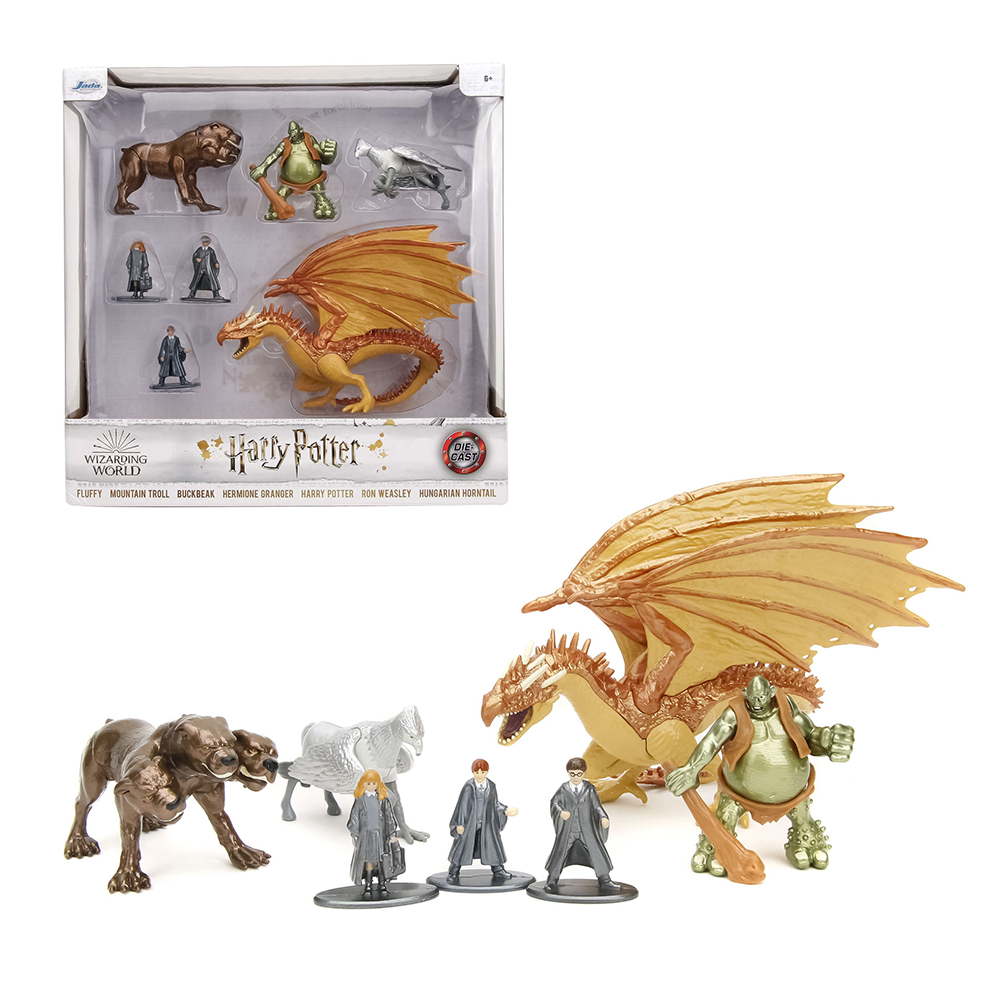 Set de 7 figuras coleccionables hechas de metal fundido a presión. Este pack de ‘Harry Potter’ MetalFigs incluye a Harry, Ron, Hermione, Buckbeak, Fluffy, el Horntail húngaro y un troll de montaña. El peso del metal fundido a presión y la atención al detalle distinguen a estas figuras como un coleccionable de primera calidad. Tamaño aprox. de 4 a 10 cm.