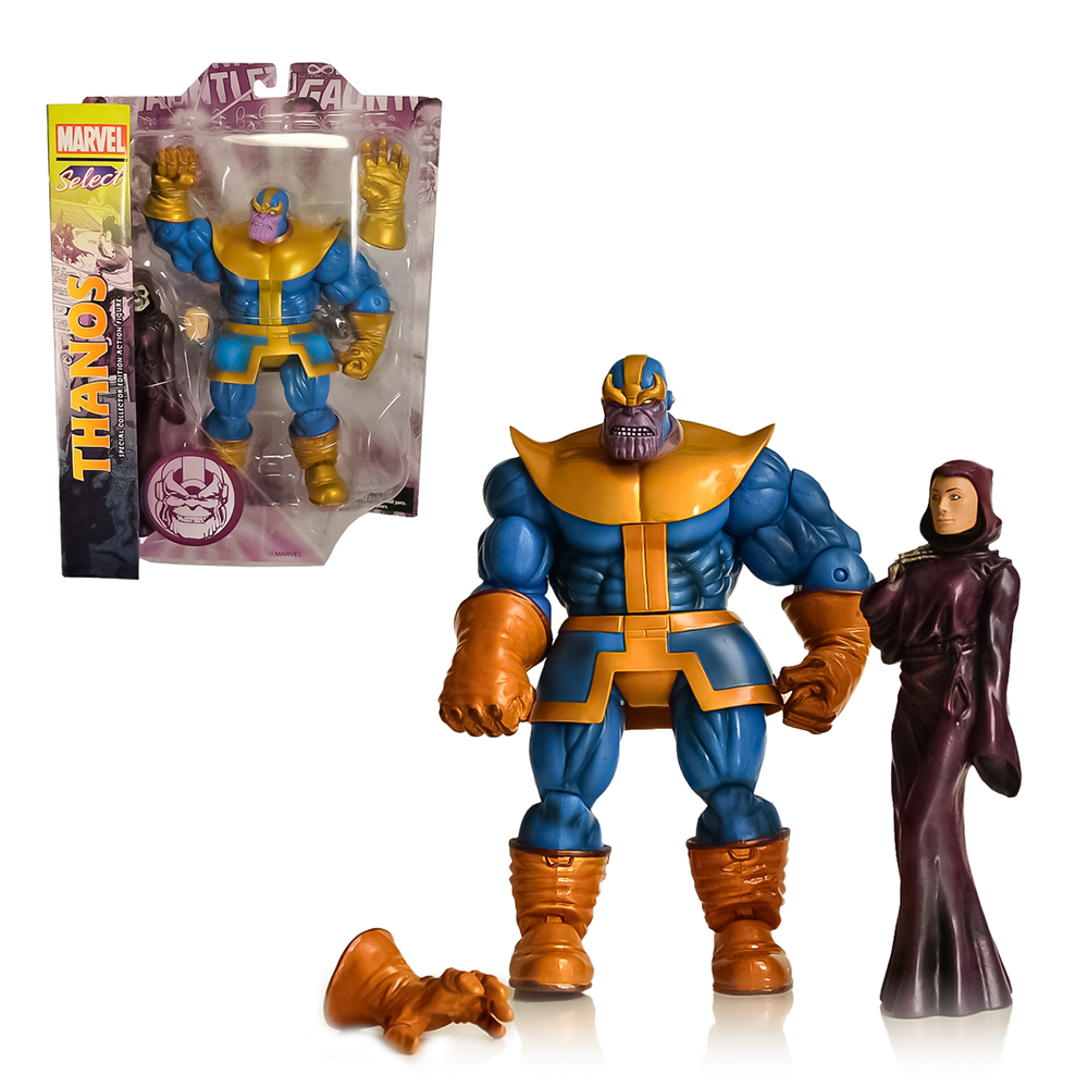 La figura de PVC mide unos 20 cm de alto y cuenta con 14 puntos de articulación. Incluye el guantelete del infinito extraíble y una figura no articulada con cara intercambiable de su amada Muerte.