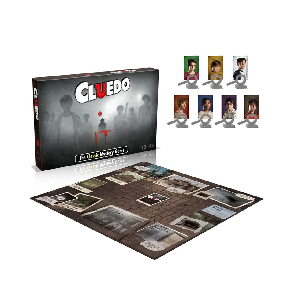 Juego de mesa Cluedo ‘IT’ basado en las películas de terror de 2017 y 2019, inspiradas en la clásica novela de Stephen King. Asumirás el papel de los niños de IT para determinar quién secuestrará Pennywise, qué objeto utilizará para atraerlos, y dónde los llevará. Los jugadores se moverán por el tablero de juego que representa lugares en y alrededor de la ciudad de Derry, Maine.