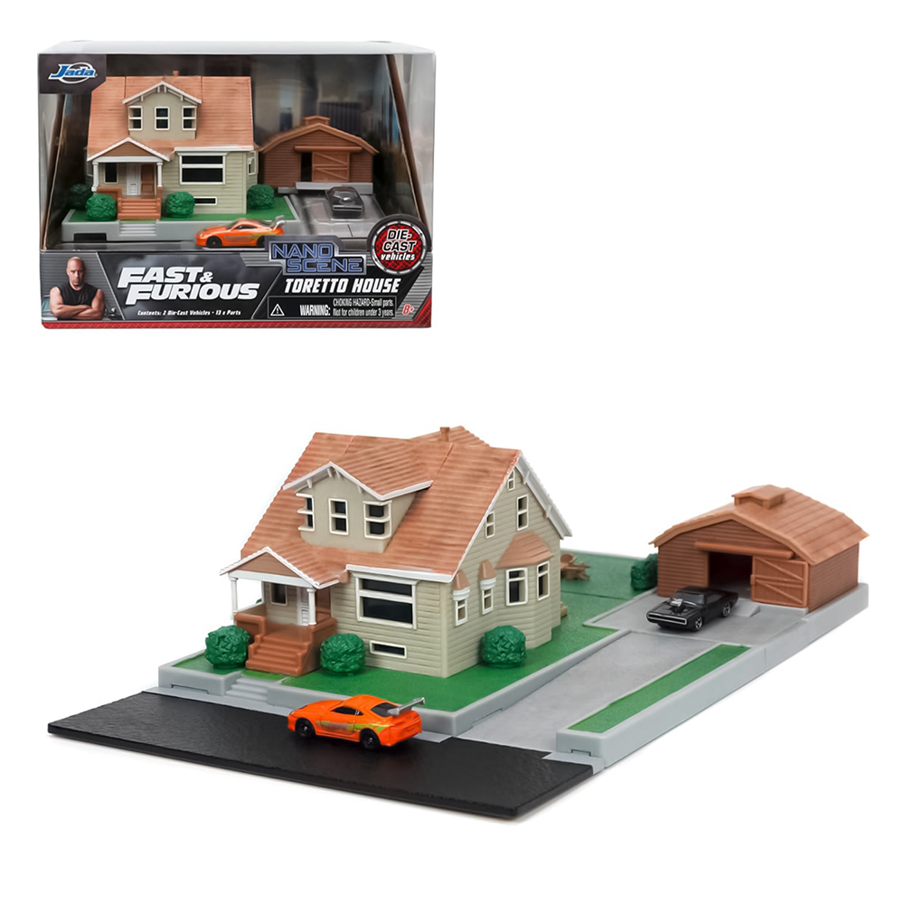 La casa de Dom reproducida en 360° por Jada Toys. Diorama con casa, garaje y zona exterior con barbacoa, mesa y sillas. Maqueta de la casa de Dominic Toretto. Accesorios: 2 nano vehículos de metal (Dodge Charger y Toyota Supra) con ruedas libres y neumáticos de goma. Dimensiones: 14 x 20 x 20 cm, coches: 4 cm cada uno.