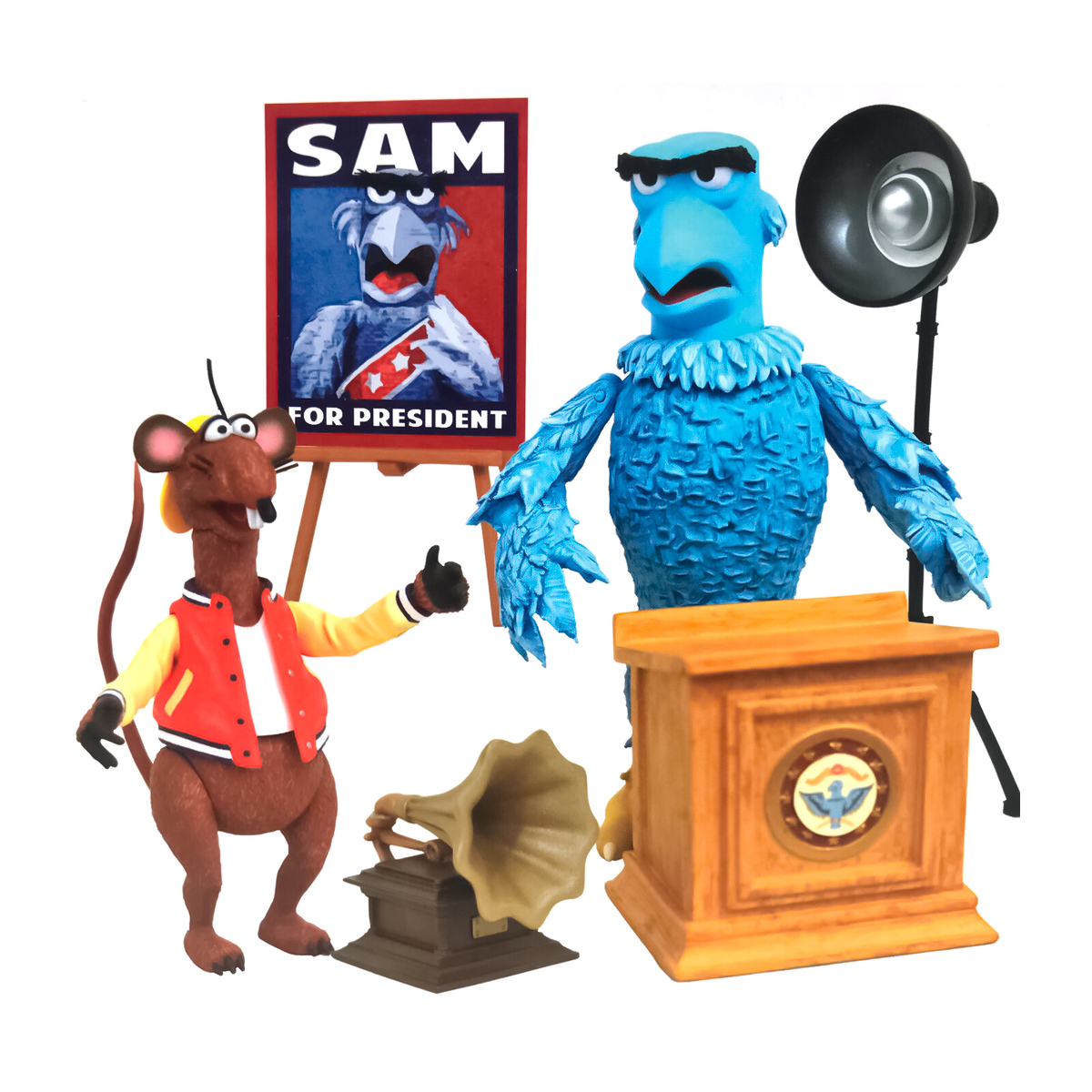 Estas figuras de acción miden 12 cm (Sam) y 8 cm (Rizzo), respectivamente, y cada una incluye múltiples puntos de articulación. Los accesorios incluyen un podio (con el sello presidencial de Sam), un reflector, un fonógrafo, un caballete y un póster a escala de ‘Sam for President’. Juntos vienen empaquetados en una caja con ventana a todo color.