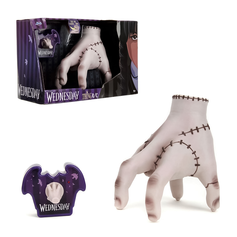 Jada Toys presenta la réplica con radio control de Cosa. Tiene una altura de unos 18 cm y está basada en su apariencia en la serie ‘Wednesday’. Cuenta con función de carga USB e incluye un mando con forma de murciélago (con mini Cosa como botón de control). Se necesitan 2x pilas AAA para su funcionamiento (incluidas).