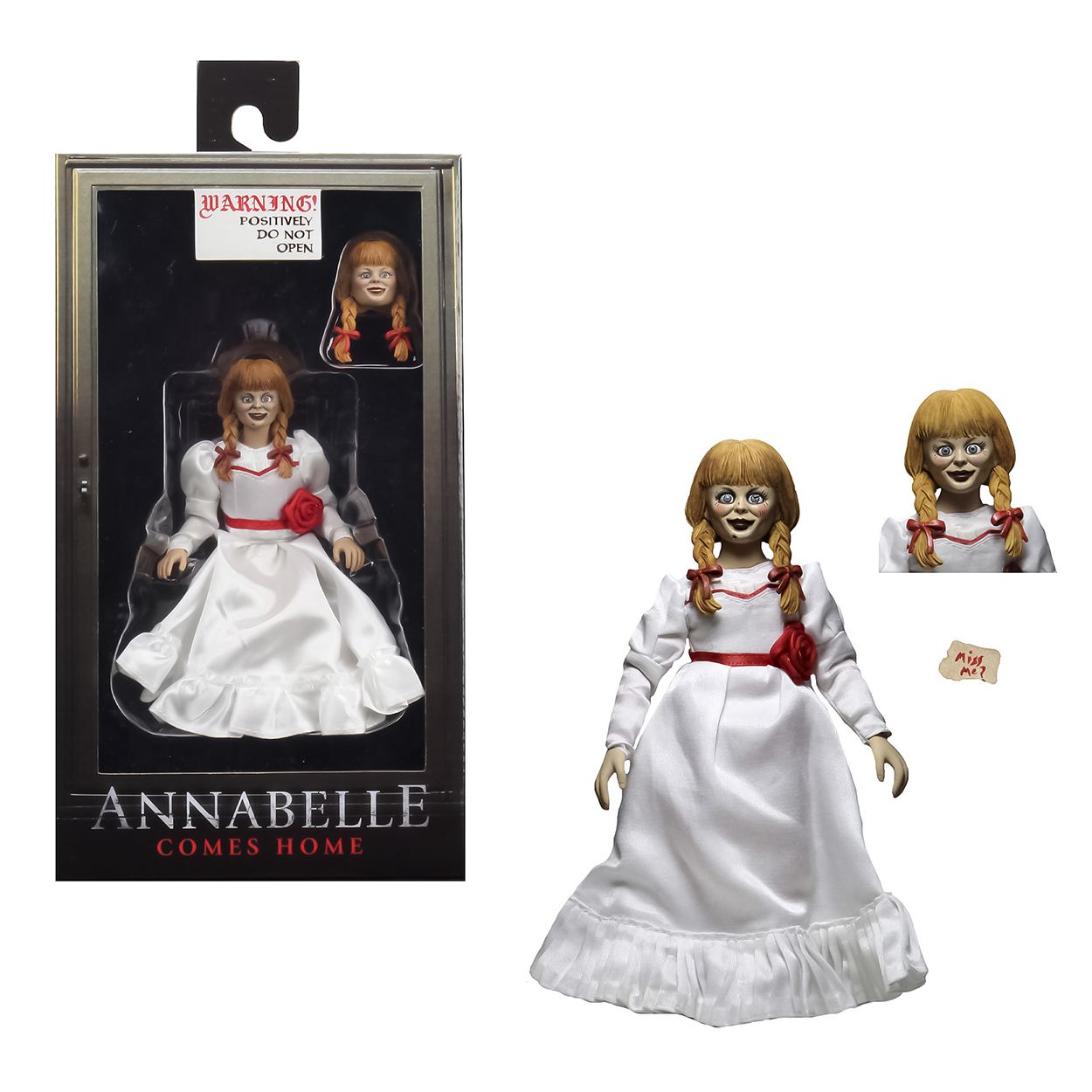 Neca presenta la figura de Annabelle, basada en la película de terror ‘Annabelle Comes Home’. La figura articulada mide unos 20 cm, está hecha de PVC y contiene dos cabezas intercambiables. Empaquetada en una caja de exhibición que se asemeja a su vitrina protectora.