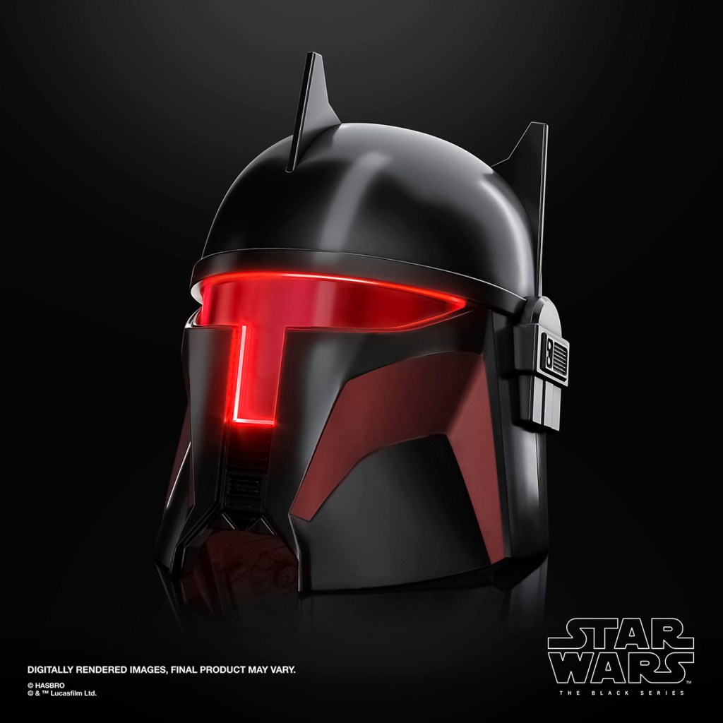 Réplica a tamaño real. Cuenta con una visera frontal iluminada, una luz interior y un modo de visualización. Si mantienes el botón pulsado, las luces interiores y de la visera se activarán hasta aproximadamente una hora. La visera se ilumina de color rojo de manera fija y las luces interiores parpadean. Para su funcionamiento se requieren 2x pilas AAA (no incluidas).