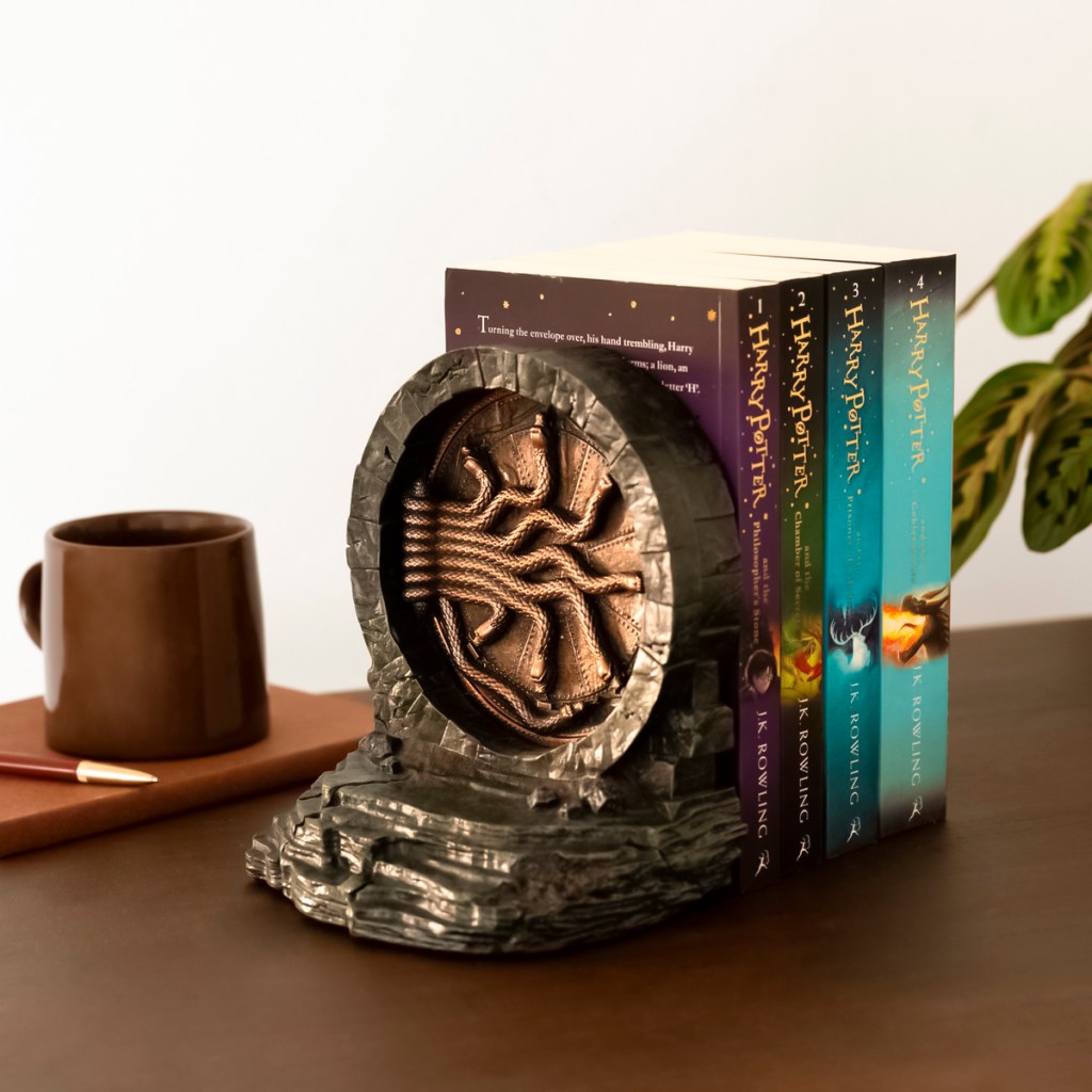 Este sujetalibros de ‘Harry Potter’ tiene la forma de la enigmática puerta de la Cámara de los Secretos y es el complemento ideal para colocar en tu estantería junto a tu colección de libros. Fabricado en resina de gran calidad y pintado a mano a todo color. Se puede colocar tanto en medio como a un extremo de aquello que se quiera sujetar. Medidas: 17,5 x 15 x 11,6 cm.