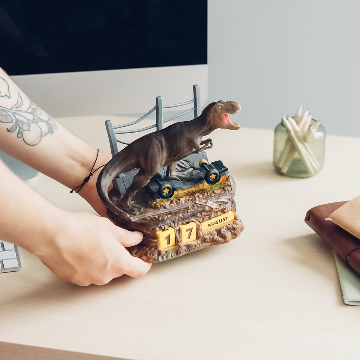 Este calendario perpetuo 3D de ‘Jurassic Park’ inspirado en el T-Rex ha sido fabricado en resina y pintado a mano a todo color. Incluye 5 bloques con días y meses que se pueden intercambiar y combinar para configurar todas las fechas posibles de un mismo año. Medidas: 17,7 x 16,3 x 12,2 cm.