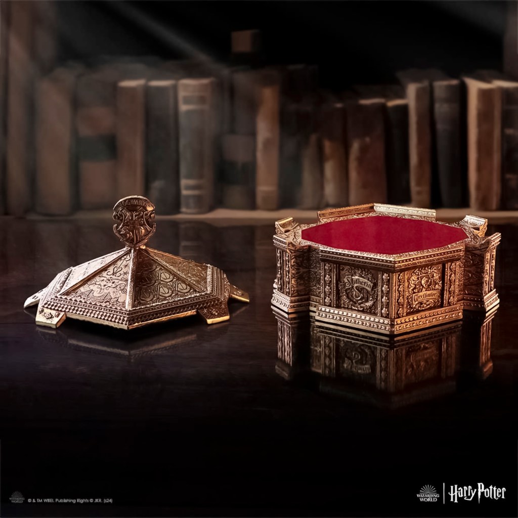 Fundida en la mejor resina antes de ser terminada en bronce, esta caja de baratija de Hogwarts está hecha para mantener seguros todos sus tesoros secretos. Tamaño aprox. 13 cm.