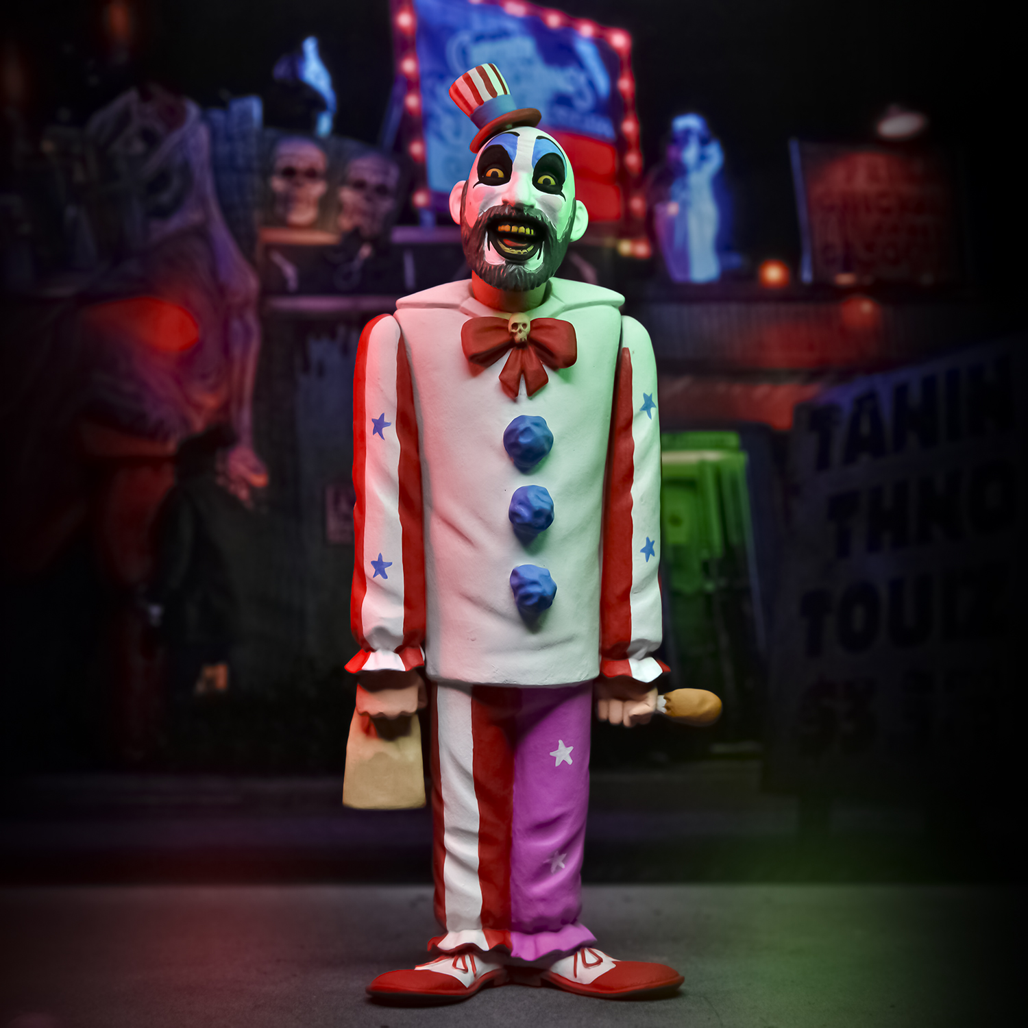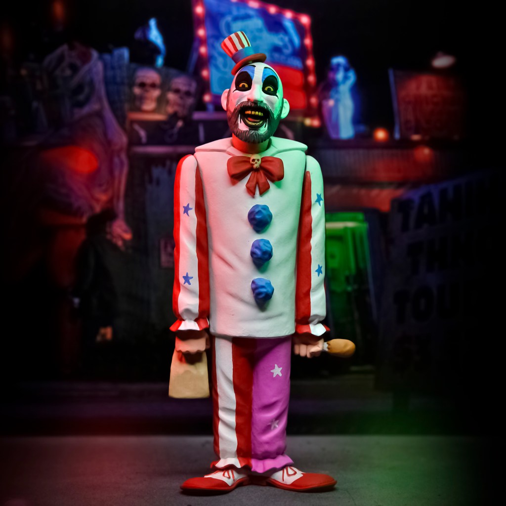 Neca presenta dentro de su línea de productos la nueva figura de Capitán Spaulding de ‘La casa de los 1000 cadáveres’ de la línea Tonny Terrors. La figura mide 15 cm. Viene en un paquete de tarjeta blíster con un fondo de recorte de bonificación.