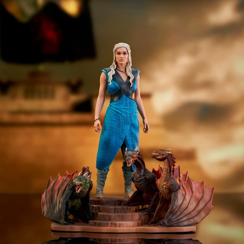 Figura de PVC de Daenerys rodeada de sus tres jóvenes dragones. Con una altura aproximada de 25 cm, de alta calidad con aplicaciones detalladas de escultura y pintura. Viene empaquetado en una caja con ventana a todo color.