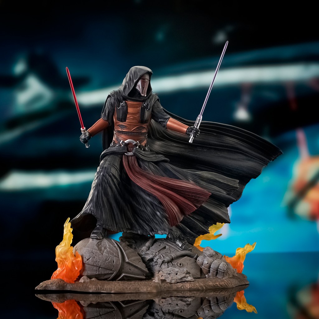 Darth Revan se encuentra encima de una estatua en llamas con dos sables de luz y una túnica aleteante en esta nueva Galery Diorama de Gentle Giant LTD. Con aplicaciones detalladas de escultura y pintura, incluyendo llamas translúcidas y hojas de sable de luz, está hecho de PVC de alta calidad y viene empaquetado en una caja de ventana a todo color. Tamaño aprox. 25 cm.