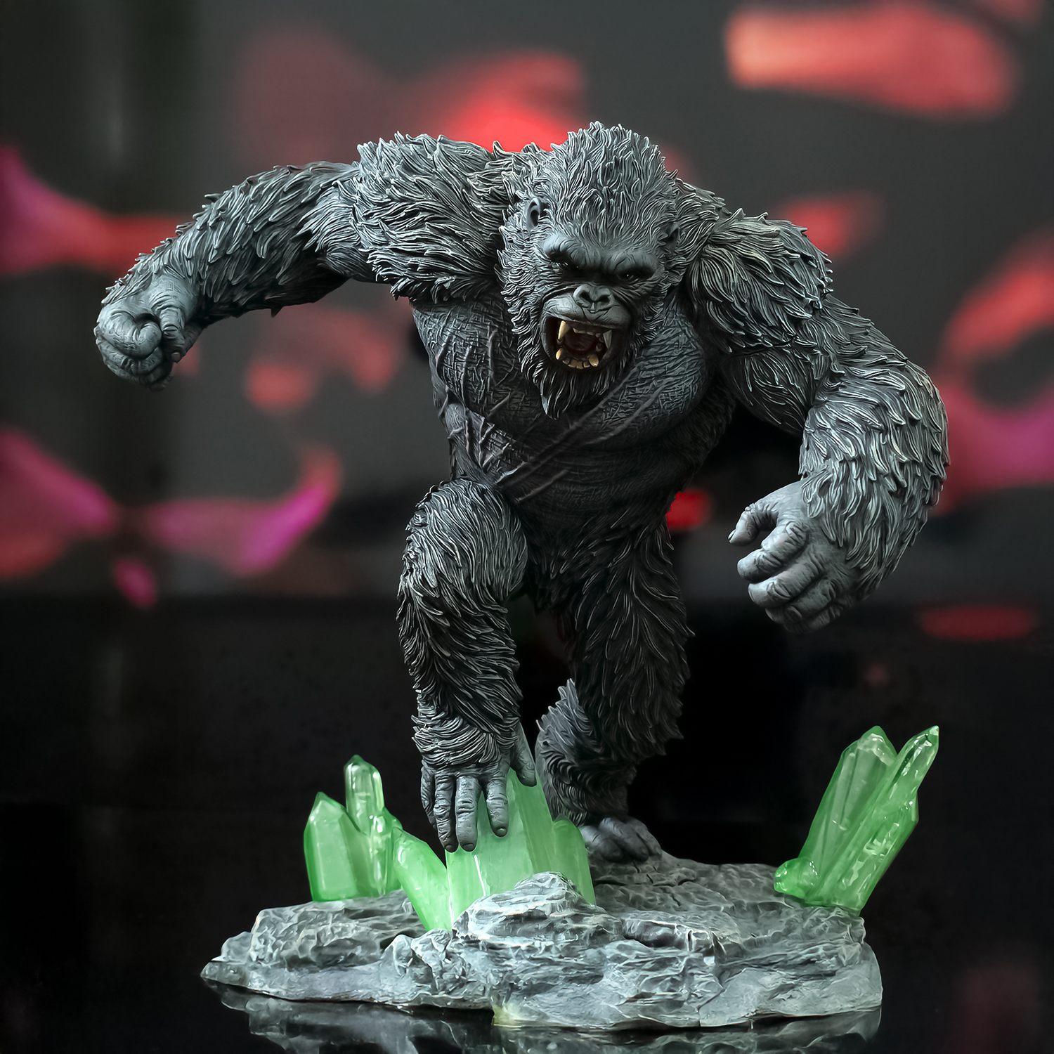 El Rey de la Selva está aquí, ¡y es increíble! Con aproximadamente 23 cm de altura, Kong ocupa su lugar en la línea de estatuas de PVC de Gallery Diorama, rodeada de cristales verdes sobre una base rocosa. Basado en su apariencia en ‘Godzilla x Kong: The New Empire’ y hecho de PVC de alta calidad, viene empaquetado en una caja de ventana a todo color.