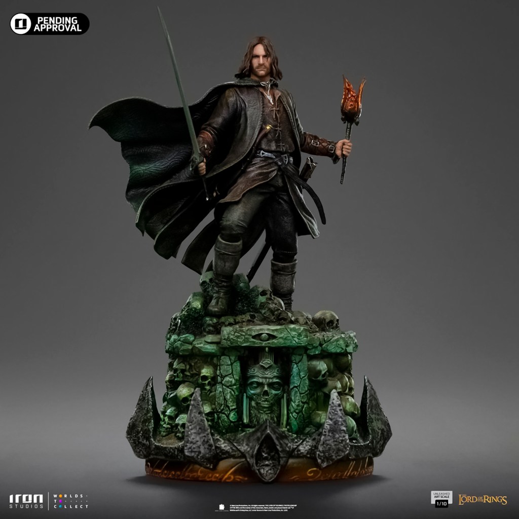 Esta figura de Aragorn, inspirada en el personaje de ‘El Señor de los Anillos’, es una edición limitada (no numerada) a escala 1/10. Tamaño aprox. 31 cm. Fabricada en poliresina. Pintada a mano.