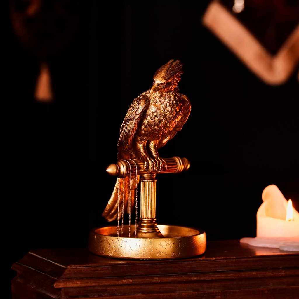 Lleva la magia de ‘Harry Potter’ a tu hogar con esta encantadora figura de Fawkes the Phoenix. Este personaje icónico proporciona magia eterna de Hogwarts en casa para los fanáticos del mundo mágico. El soporte de joyería de resina dorada tiene 21 cm de altura y muestra un acabado de efecto metálico completo con diseño 3D de Hogwarts. El accesorio perfecto que iluminará cualquier espacio de dormitorio.