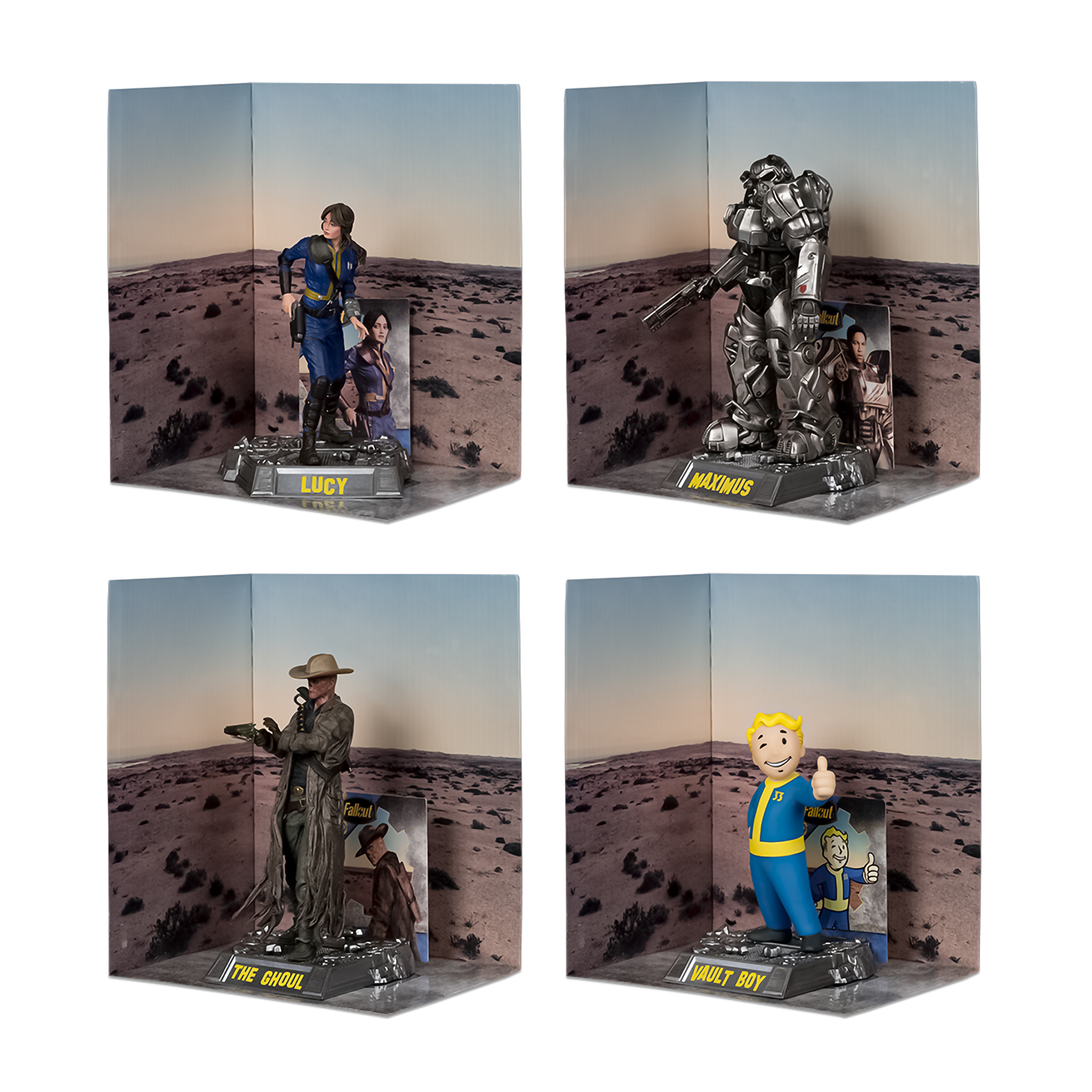 Pack de 4 estatuas de PVC de la serie ‘Fallout’ (Lucy, Maximus, The Ghoul & Vault Boy). Tamaño aprox. 15 cm. Vienen con una base y un certificado de autenticidad en una caja con ventana. De la linea Movie Maniacs de McFarlane.