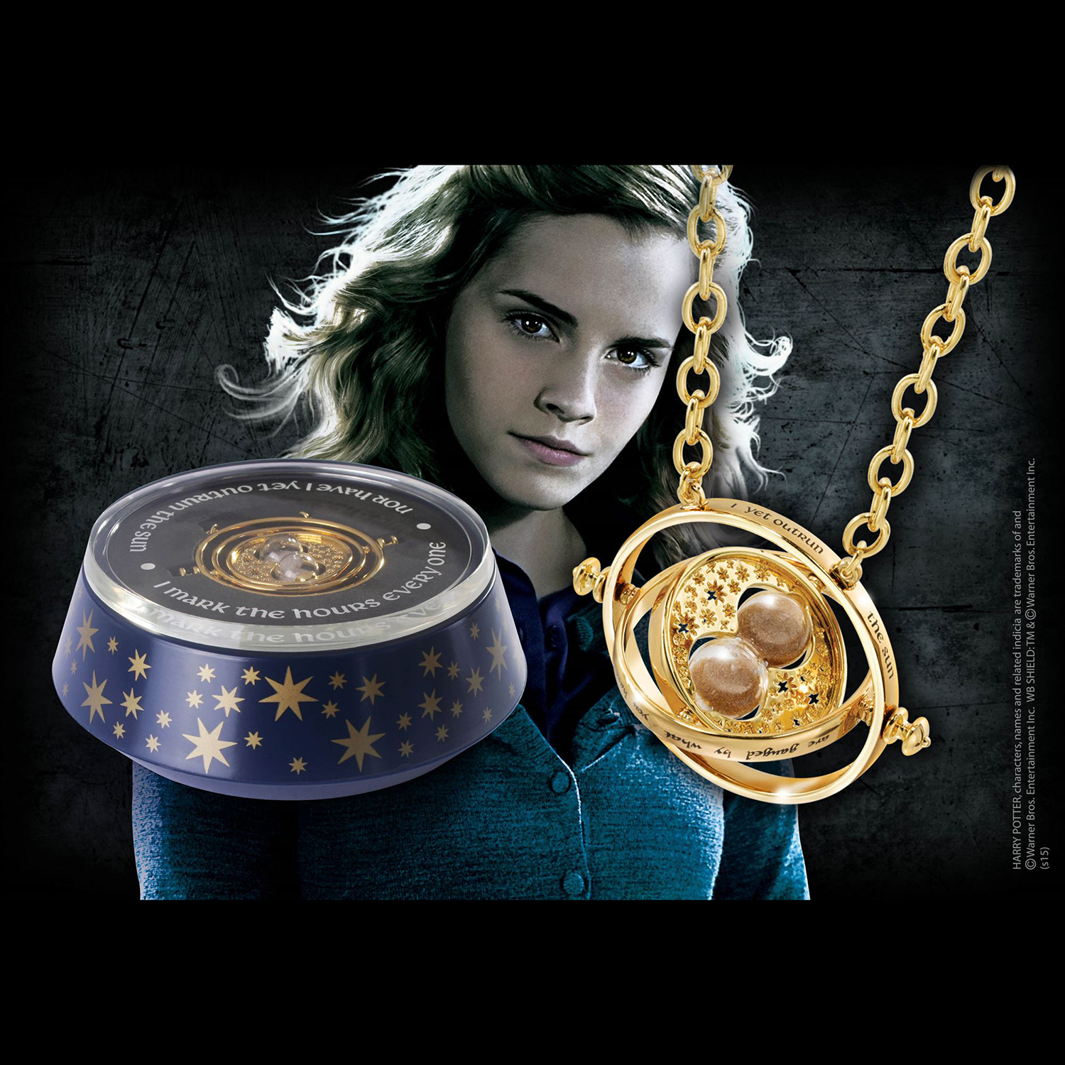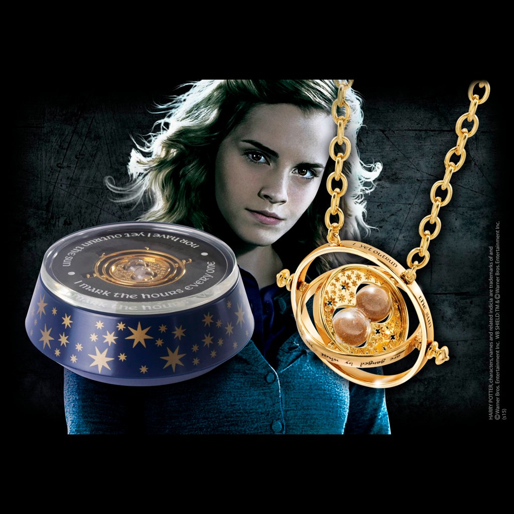 Auténtica réplica del giratiempo de Hermione. Centrado con un reloj de arena en miniatura que funciona con anillos giratorios interiores. Mide 5 cm de diámetro, la cadena tiene 76 cm de largo. Chapado en oro de 24 quilates e incluye caja de colección.