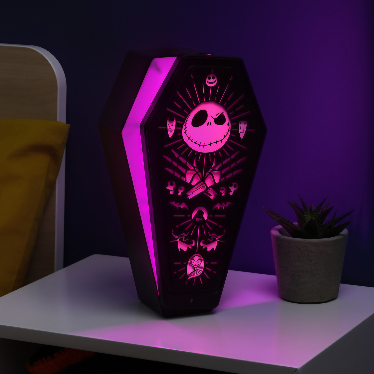 ¡Esta lámpara con forma de ataúd de ‘Pesadilla antes de Navidad’ iluminará tus noches con un estilo espeluznante!. Alimentado por USB o 3 pilas AAA (no incluidas). Cuenta con dos colores claros y cuatro ajustes de brillo. Tamaño aprox. 28 cm de altura.