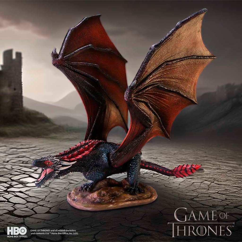 Fabricado en resina, expertamente esculpido y pintado a mano. Cuenta con Drogon con las alas abiertas, la boca abierta, listo para rugir o respirar fuego. Viene en una caja de color de la marca ‘Juego de Tronos’, con alas extraíbles para un transporte seguro. Tamaño aprox.: 28 cm.