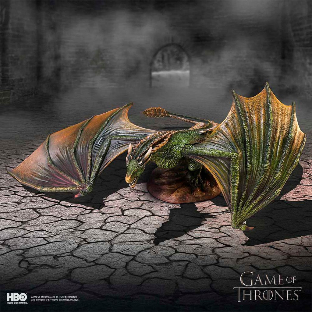Fabricado en resina, expertamente esculpido y pintado a mano. Cuenta con Rhaegal con la cabeza baja, la boca cerrada y las alas abiertas para mantener el equilibrio mientras se mueve por el suelo. Viene en una caja de color de la marca ‘Juego de Tronos’, con alas extraíbles para un transporte seguro. Tamaño aprox.: 43 cm.