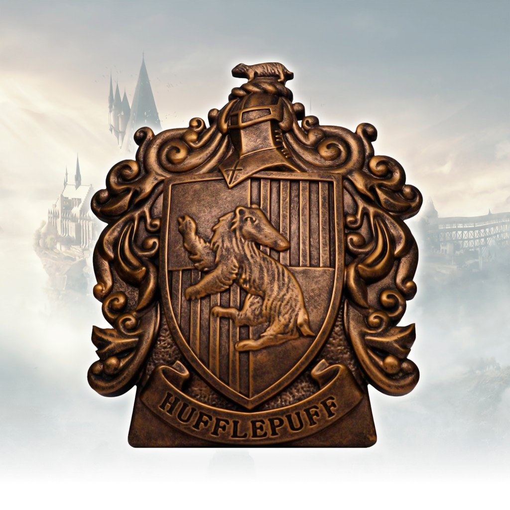 Hucha de la casa Hufflepuff con forma de escudo y con su mascota, el tejón. Con un diseño detallado y un acabado envejecido tipo bronce, mide 20 cm y esta fabricado en PVC.