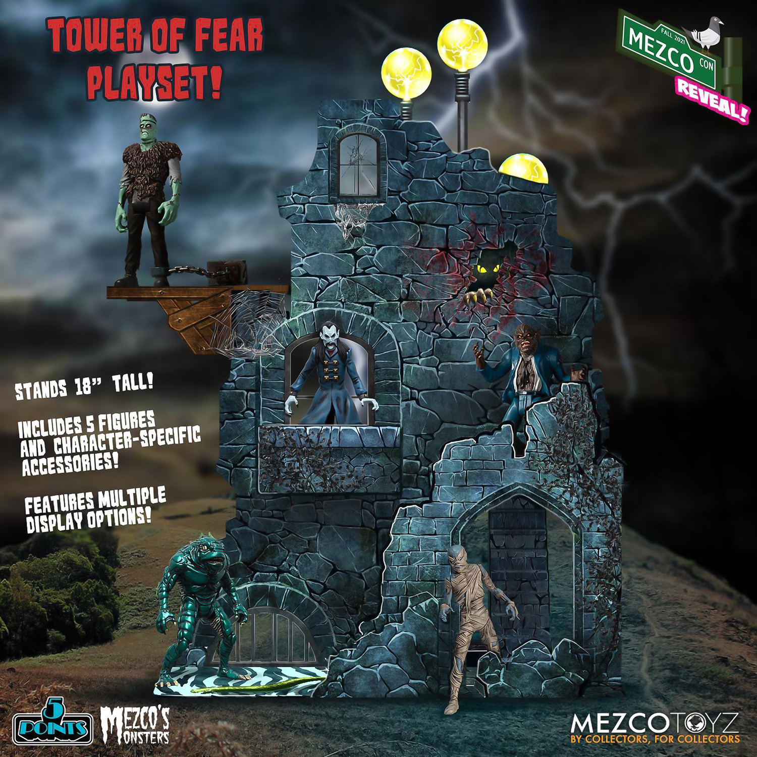Mezco presenta esta caja deluxe que contiene un diorama de 45 cm de un castillo de los Cárpatos con tres niveles (mazmorra, sala principal y laboratorio Frankenstein) acompañado de 5 figuras de los clásicos monstruos de la Universal: Frankenstein, el Hombre Lobo, Dracula, la Momia y the Sea Creature. Las figuras miden unos 10 cm y tienen 5 puntos de articulación.